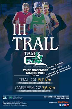 El domingo 25 de noviembre se celebra la tercera edición del Trail C4 Club de Campo Villa de Madrid con dos distancias a elegir: Una carrera competitiva de 17 kilómetros, llamada trail C4, y otra prueba no competitiva de 8 kilómetros llamada carrera C2.